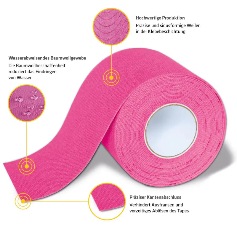 Der Klassiker im bewährten Original. Dieses bereits zigtausendfach im täglichen Einsatz verwendete Tape wird seit über 30 Jahren weiterentwickelt und vereint alle wichtigen Eigenschaften eines Kinesiologie Premium Tapes in sich. Es hält zuverlässig und über viele Tage, ist hautfreundlich und hypoallergen und besteht aus einem atmungsaktiven, elastischen Baumwollmaterial mit wasserabweisenden Eigenschaften. Du bekommst es hier im Shop in der Grösse 5cm x 5m und in den Farben blau, rosa und schwarz.